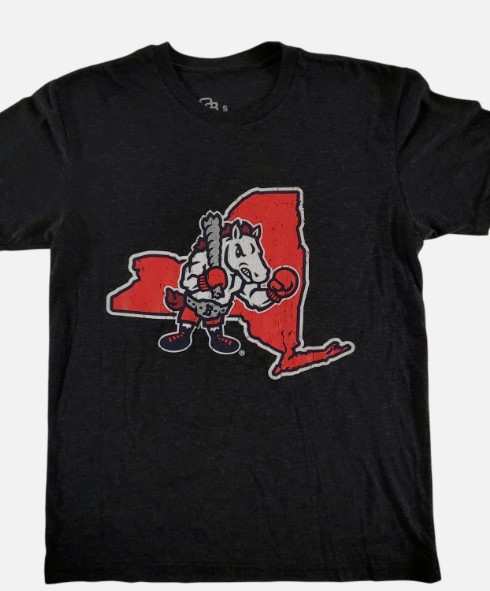 Binghamton Rumble Ponies. Binghamton is known for it’s vintage carousels. They had a contest to name the team (I think only kids could enter). One little girl said she had a dream about a carousel horse that came down from the carousel, and it was a “rumble pony.” Sure beats the old name, Binghamton Mets.