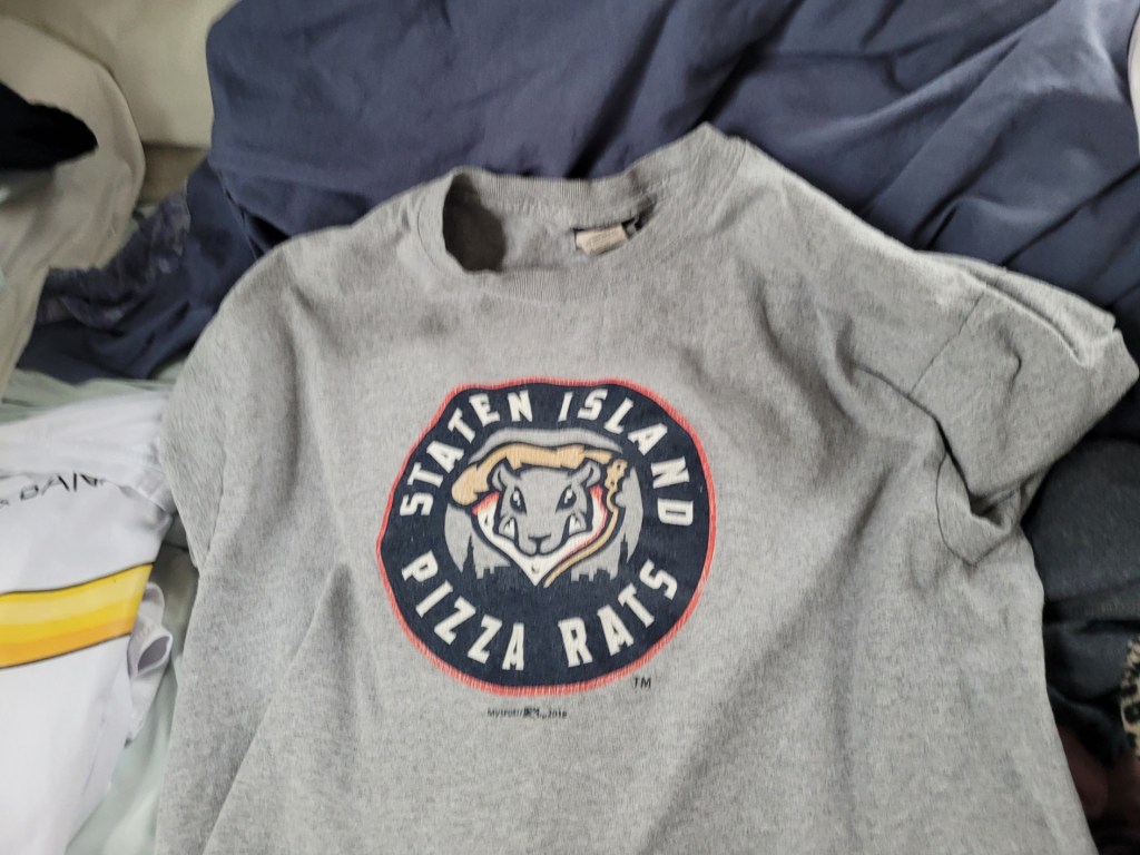 This was a prize of my collection. The Staten Island Yankees (they no longer exist) decided one summer that they would be the Pizza Rats at their home game that season. I wore that sucker for years, but it’s now way too big. I have it to my BF because he loved it.